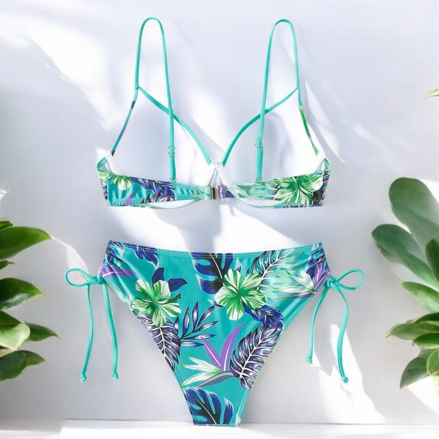 Pregătește-te să strălucești pe plajă cu acest costum de baie tropical în două piese, creat pentru a-ți pune în valoare silueta și a-ți oferi confort. Sutienul are cupe cu burete și susținere bună, iar chilotul cu talie medie și șnururi reglabile oferă un plus de libertate și feminitate.
