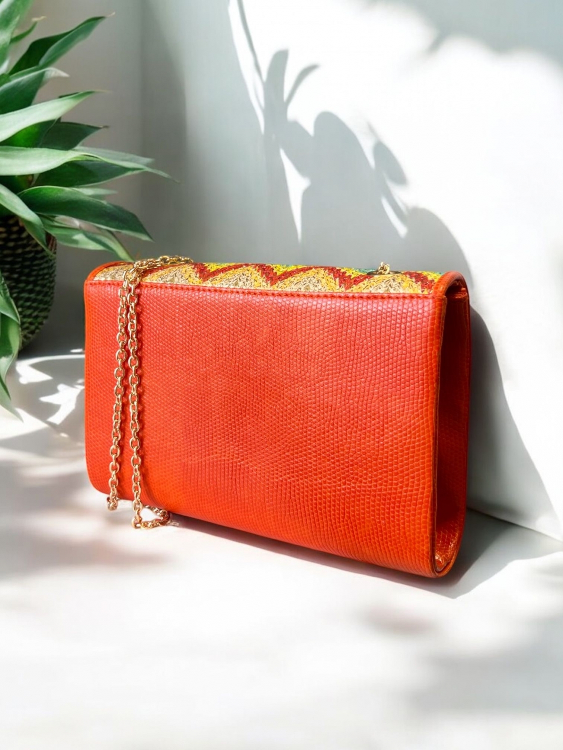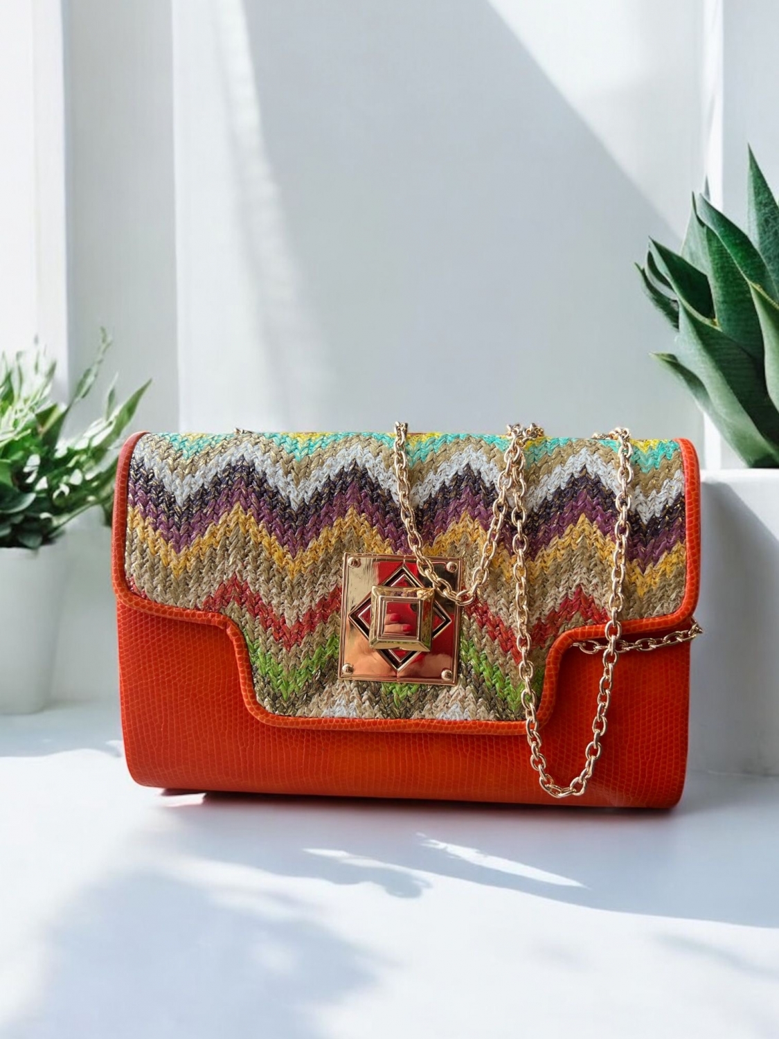 Geantă damă cu design boho și textură colorată în zig-zag. Accente portocalii, lanț auriu și închidere elegantă. Ideală pentru vară, festivaluri sau city breaks. Lungime 20 cm