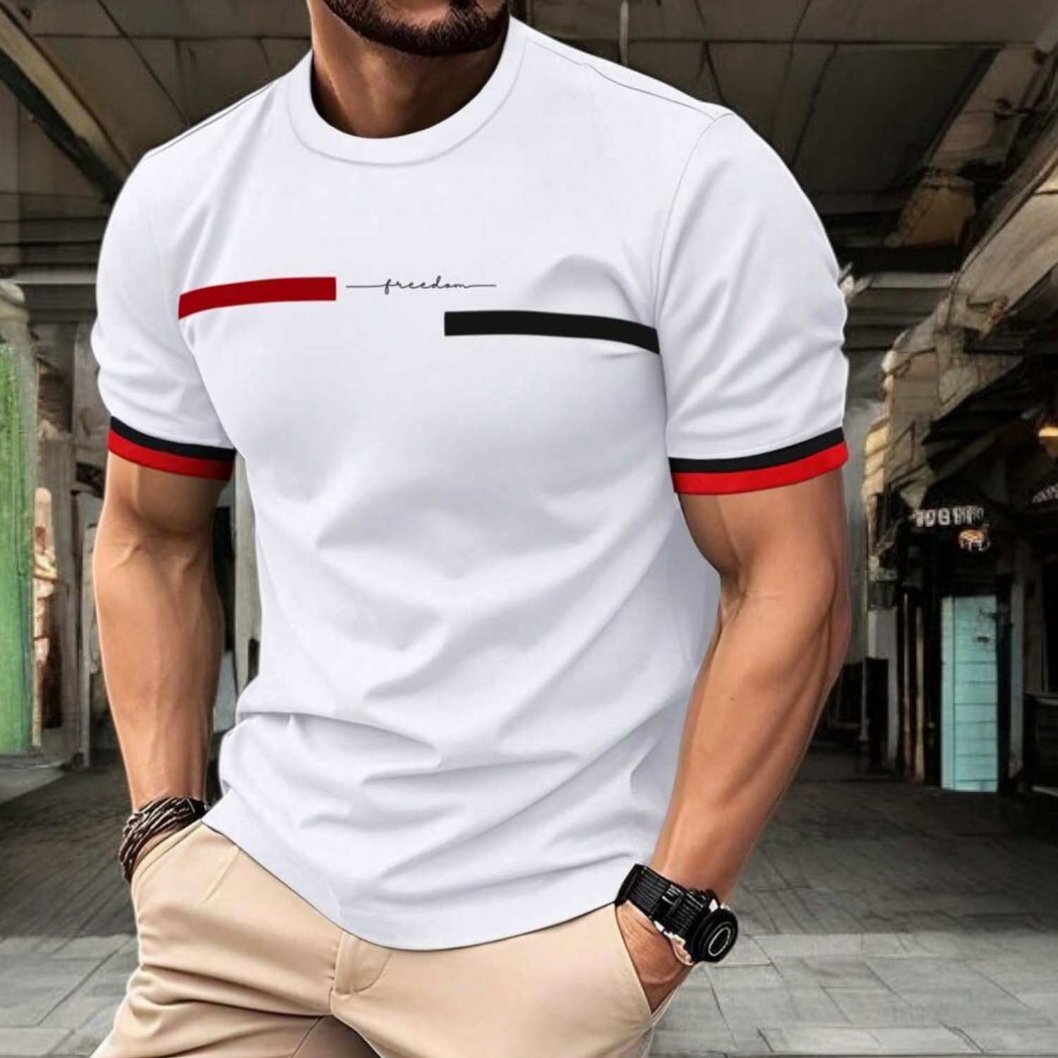 Tricou bărbătesc alb cu imprimeu „freedom” – design urban cu accente roșu-negru